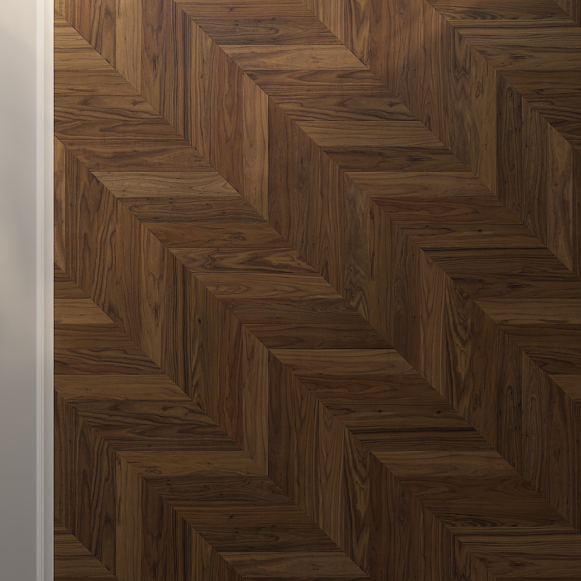 3D seamless texture and Sketchup model with the wooden floor Ebony and Co American Walnut Chevron 12x60cm TungOil. The 3D floor is ready to use in your 3D drawing. Reflection, gloss and bump layers are added.